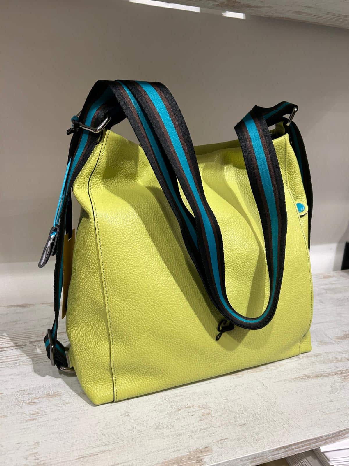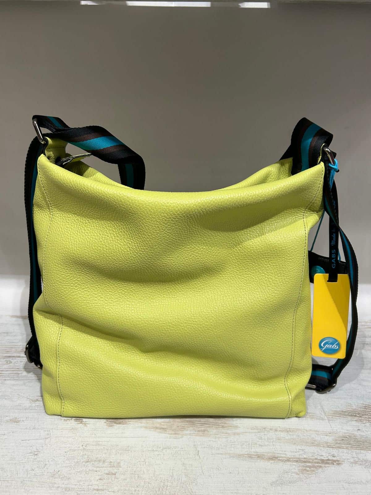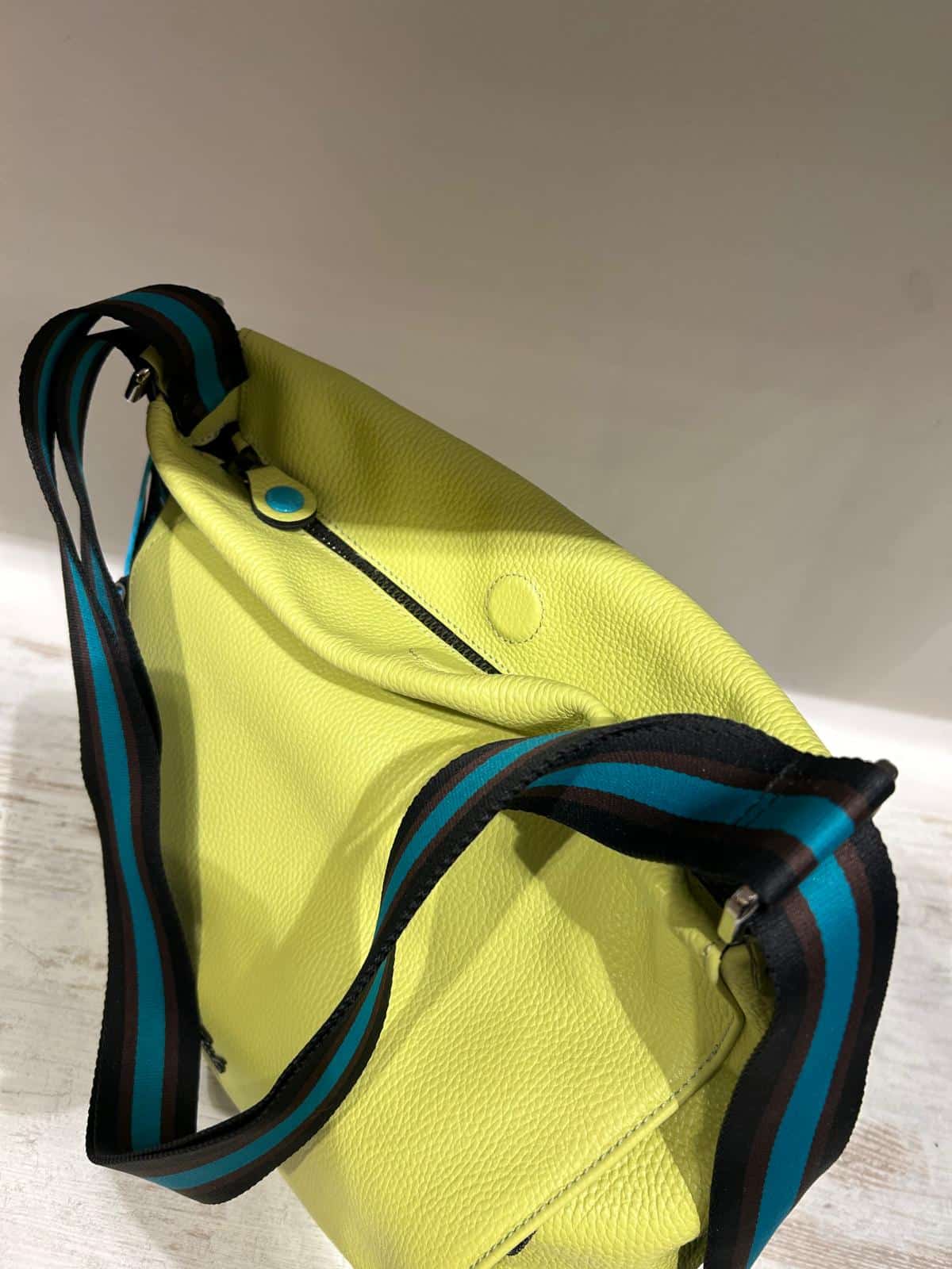 La linea “Icon Black” icona di Gabs è caratterizzata da bottone nero, zip di colore turchese e tracolla a nastro. Con la sua forma spaziosa, questa borsa è ideale per chi cerca un’opzione versatile e alla moda. • Interno Foderato • Tasca interna con chiusura a zip e due tasche porta oggetti • Realizzato in pelle di vitello opaca