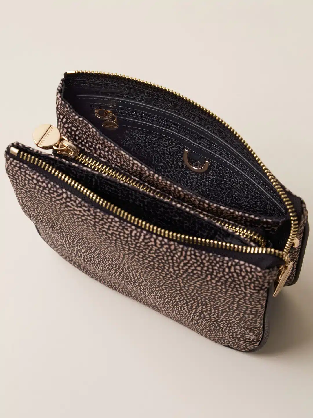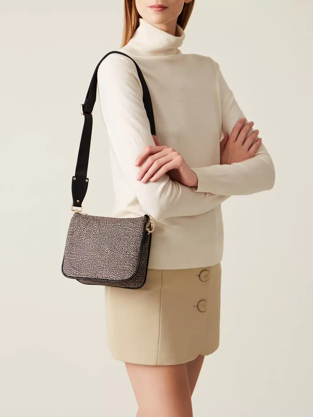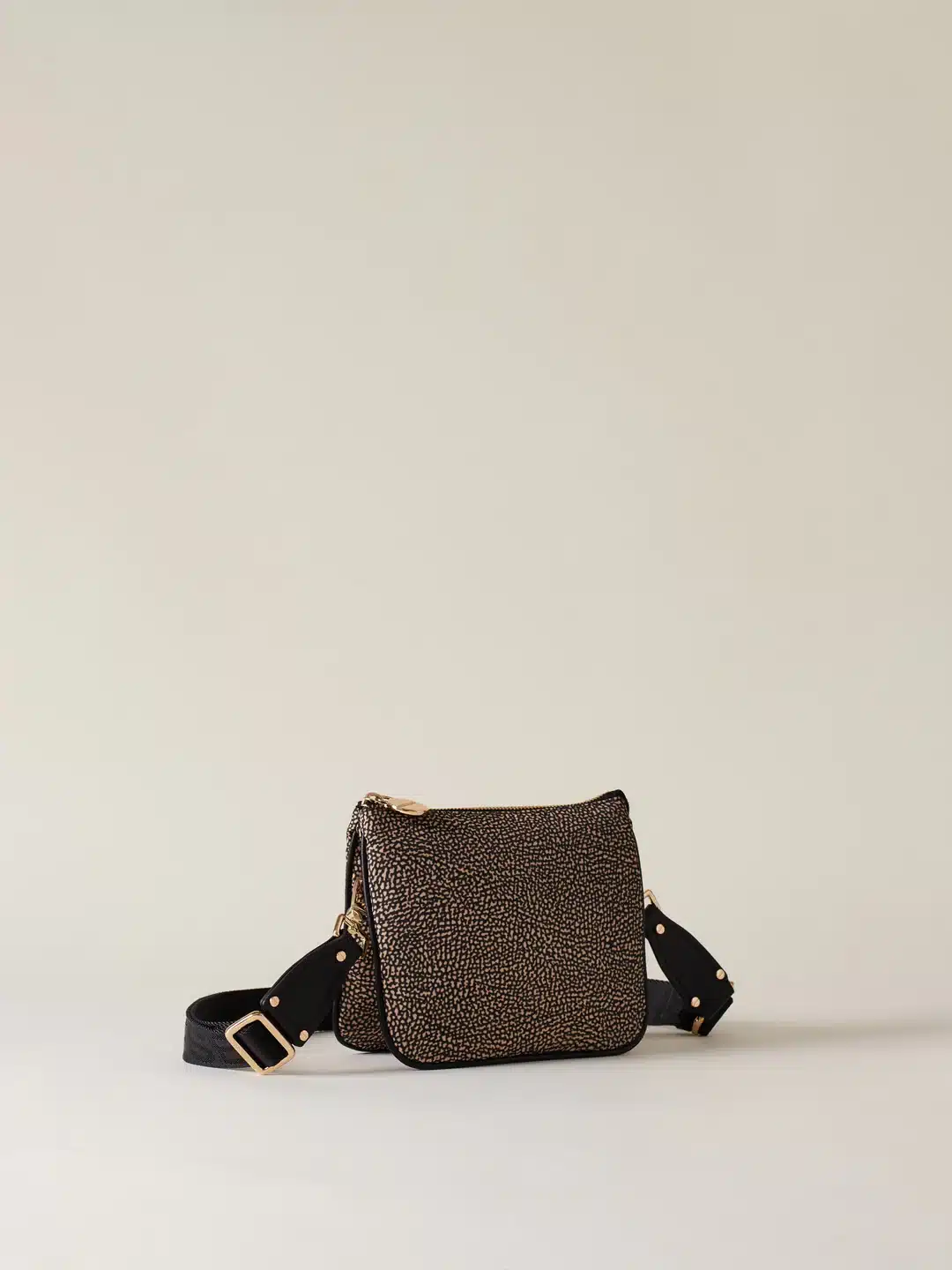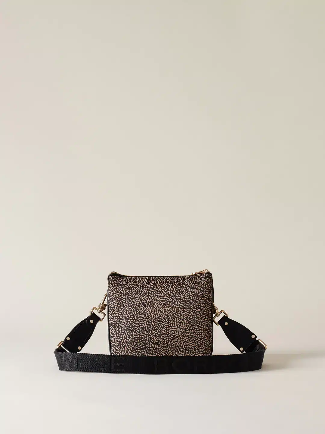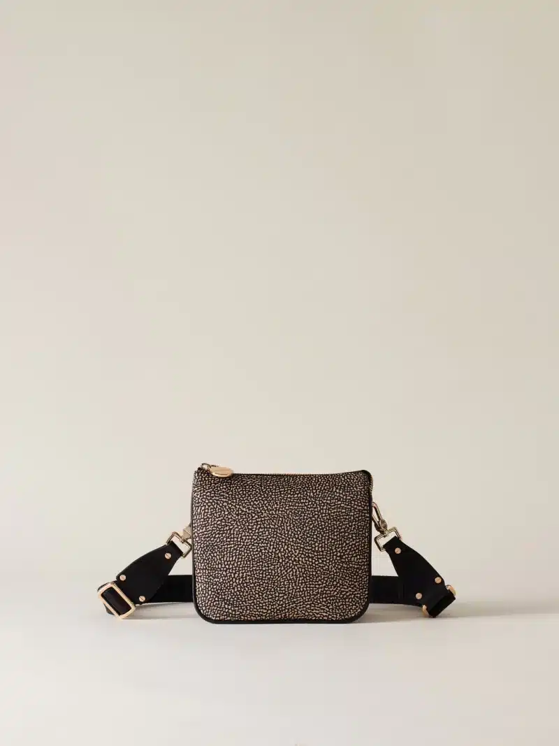 Una borsa crossover Small, ma in grado di ospitare tutto quel che serve, abbinandosi facilmente a tanti outfit. La versione che propone Borbonese è realizzata in nylon OP riciclato con dettagli di pelle. La chiusura è regolata da zip con tiralampo a vite, simbolo del brand. Oltre la tracolla, la borsa è dotata di una cinghia di nylon logato modulabile e staccabile tramite moschettoni. L’interno, foderato in tessuto jacquard, ha tasche e scomparti. Le metallerie sono in galvanica oro chiaro.