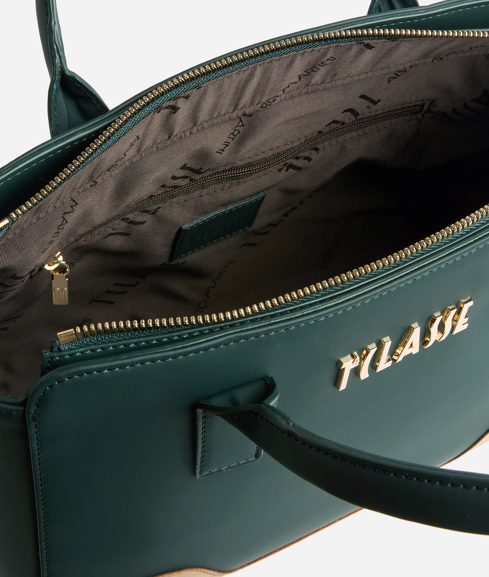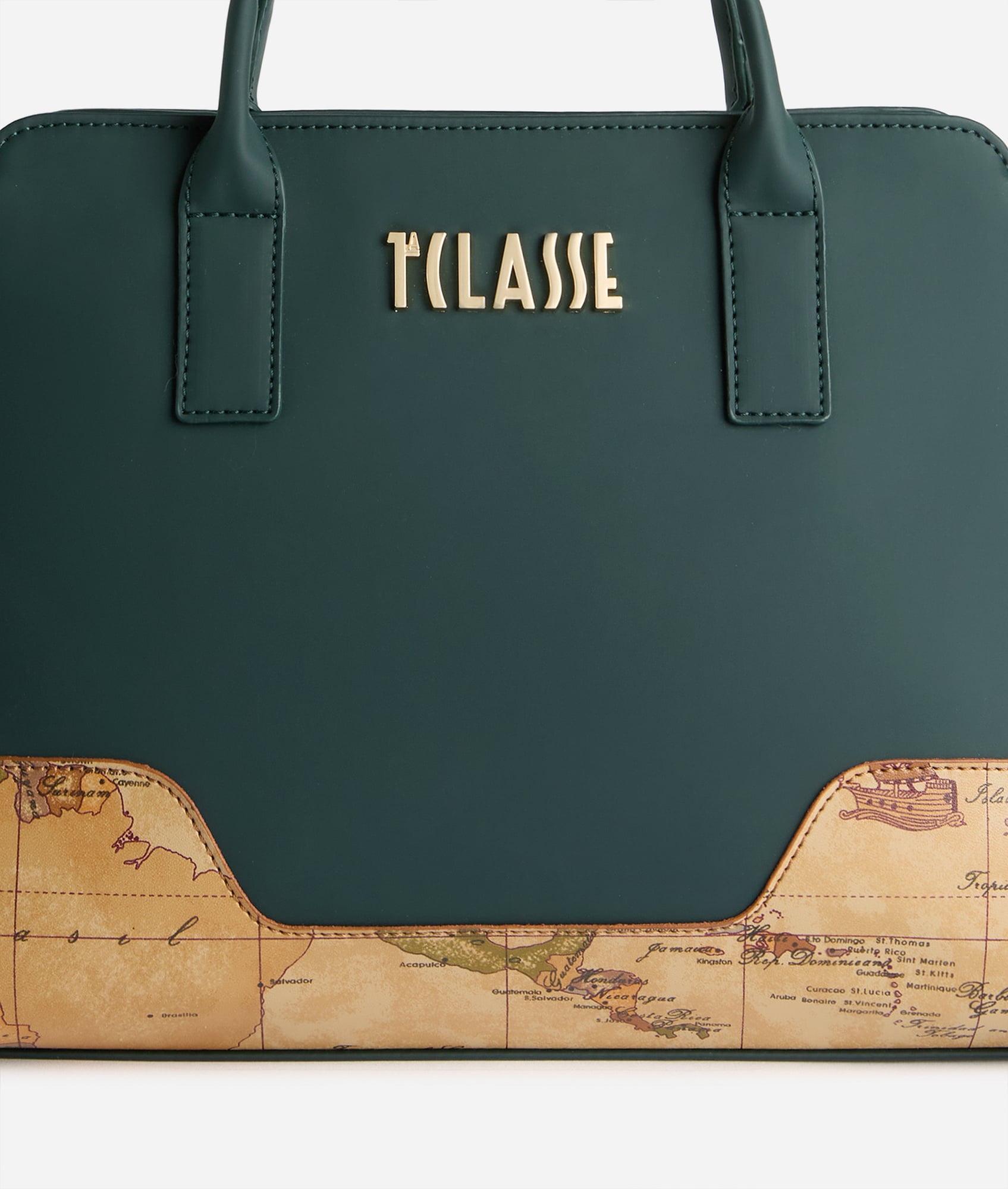 Ideale da sfoggiare in cittĂ , la borsa a mano Frost Geo è realizzata in tessuto gommato abbinato all’inserto in tessuto effetto nappa stampa Geo Classic. L’avvallamento dell’inserto riflette il posizionamento del maxi logo 1á´¬ Classe in oro chiaro, creando un design essenziale e armonioso. Dotata di tre tasche interne e una tracolla aggiuntiva regolabile per la doppia portabilitĂ , rifinirĂ i look invernali con un tocco urban-chic e l’eleganza del color Verde Bottiglia.