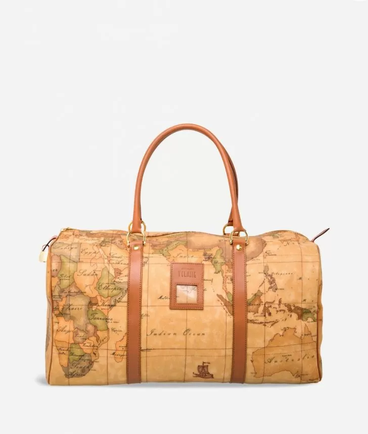 Borsa da viaggio in tessuto stampato con cartina geografica Geo Classic, manici e targhetta portanome in pelle di vacchetta color cuoio, accessori metallici e lucchetto dorati, chiusura con zip. Ideale per un breve viaggio, ti conquisterĂ  grazie ai dettagli accurati.