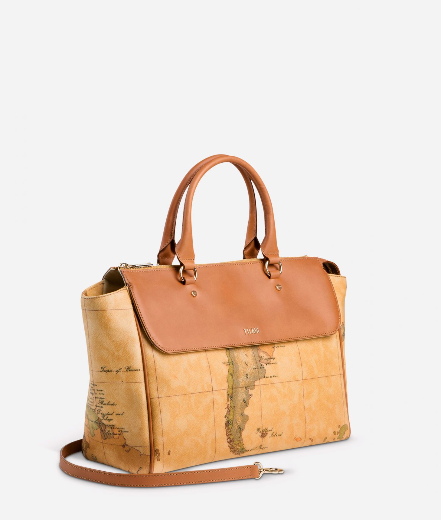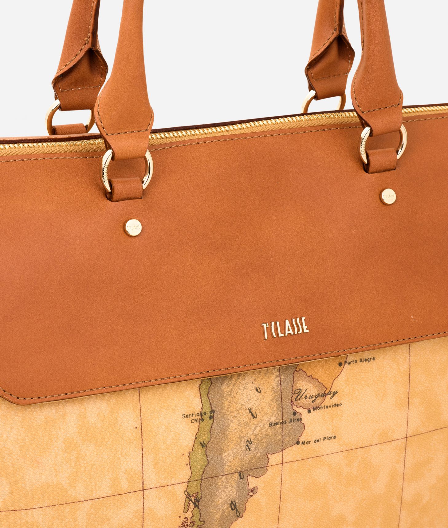 Borsa a mano in tessuto stampato con cartina geografica Geo Classic. Metalleria con logo 1AClasse e finiture in oro chiaro. Inserti e dettagli in pelle liscia di bovino color cuoio. Cuciture e coste in tono. Doppia portabilitĂ , a mano e a tracolla. Tasca frontale nascosta chiusa con bottone a calamita. Logo lettering 1AClasse in metallo dorato. Piedini protettivi in metallo dorato. Luce manici 11 cm. Luce tracolla con chiusura a gemello nel foro centrale 50 cm. Chiusura con zip. Fodera in misto cotone color naturale con logo 1AClasse. Tasca interna chiusa con zip. Porta tessere interno con logo 1AClasse impresso a caldo. Composizione: 40%Calf leather 29%CO 21%PVC 10%PU