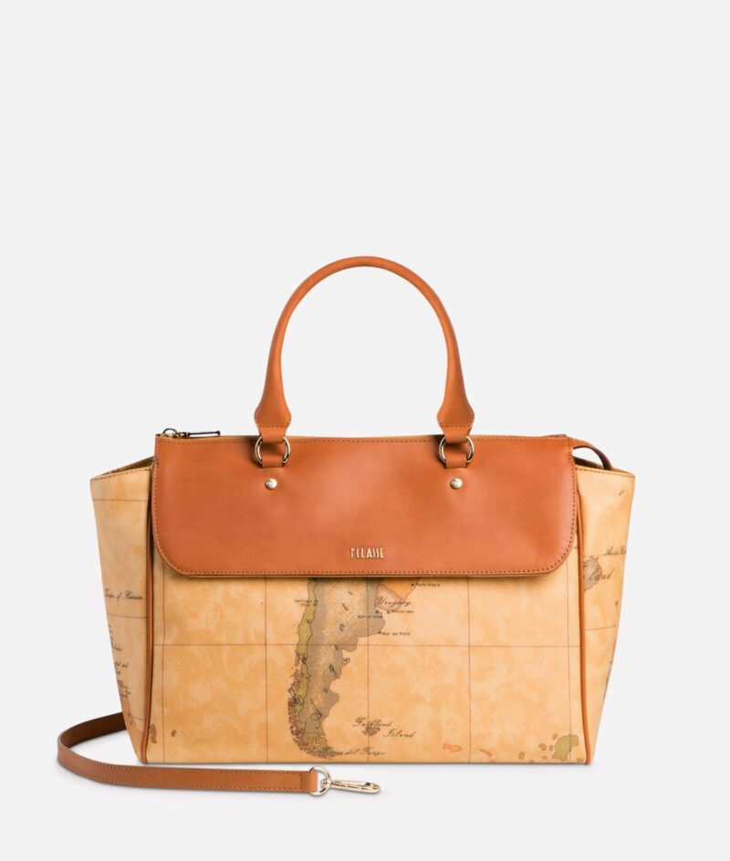 Borsa a mano in tessuto stampato con cartina geografica Geo Classic e pelle liscia di bovino color cuoio dalla doppia portabilità , a mano e a tracolla. Ha la tasca frontale nascosta, chiusura con bottone a calamita, logo lettering 1AClasse in metallo dorato. Versatile e femminile, è il complemento perfetto per le tue mise cittadine.