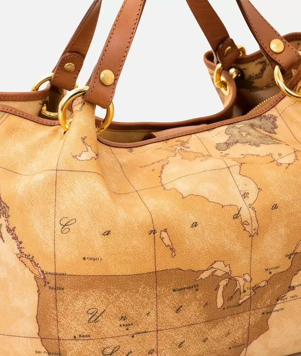 Borsa a mano in tessuto stampato con cartina geografica Geo Classic dalla doppia portabilitĂ , a mano e a tracolla. Ha i manici e la tracolla regolabile e removibile in pelle e la chiusura con bottone a calamita. Il volume morbido e la cura dei dettagli tipici della lavorazione Made in Italy la rendono il completamento ideale dei tuoi outfit urbani. Disponibile in due misure.
