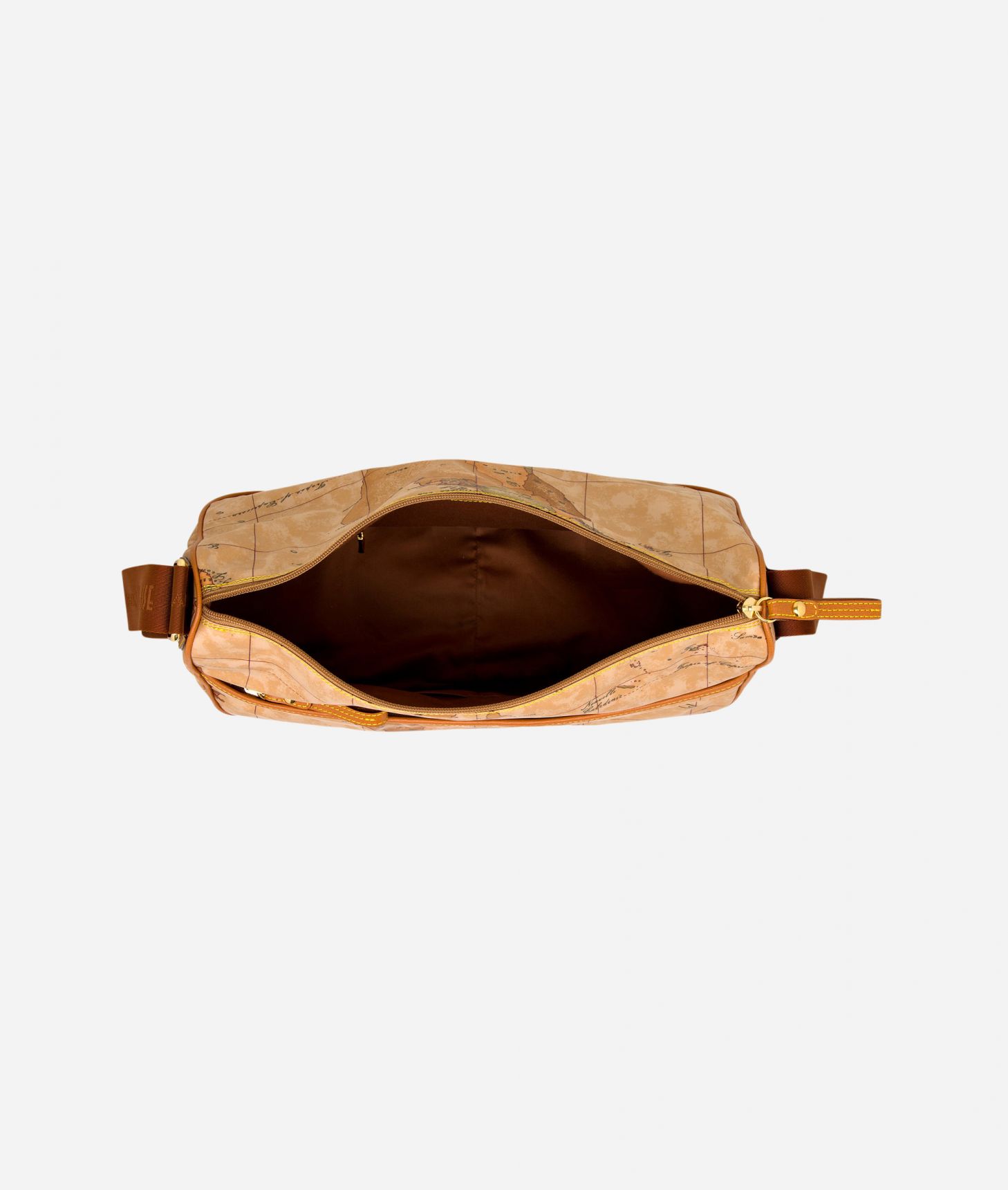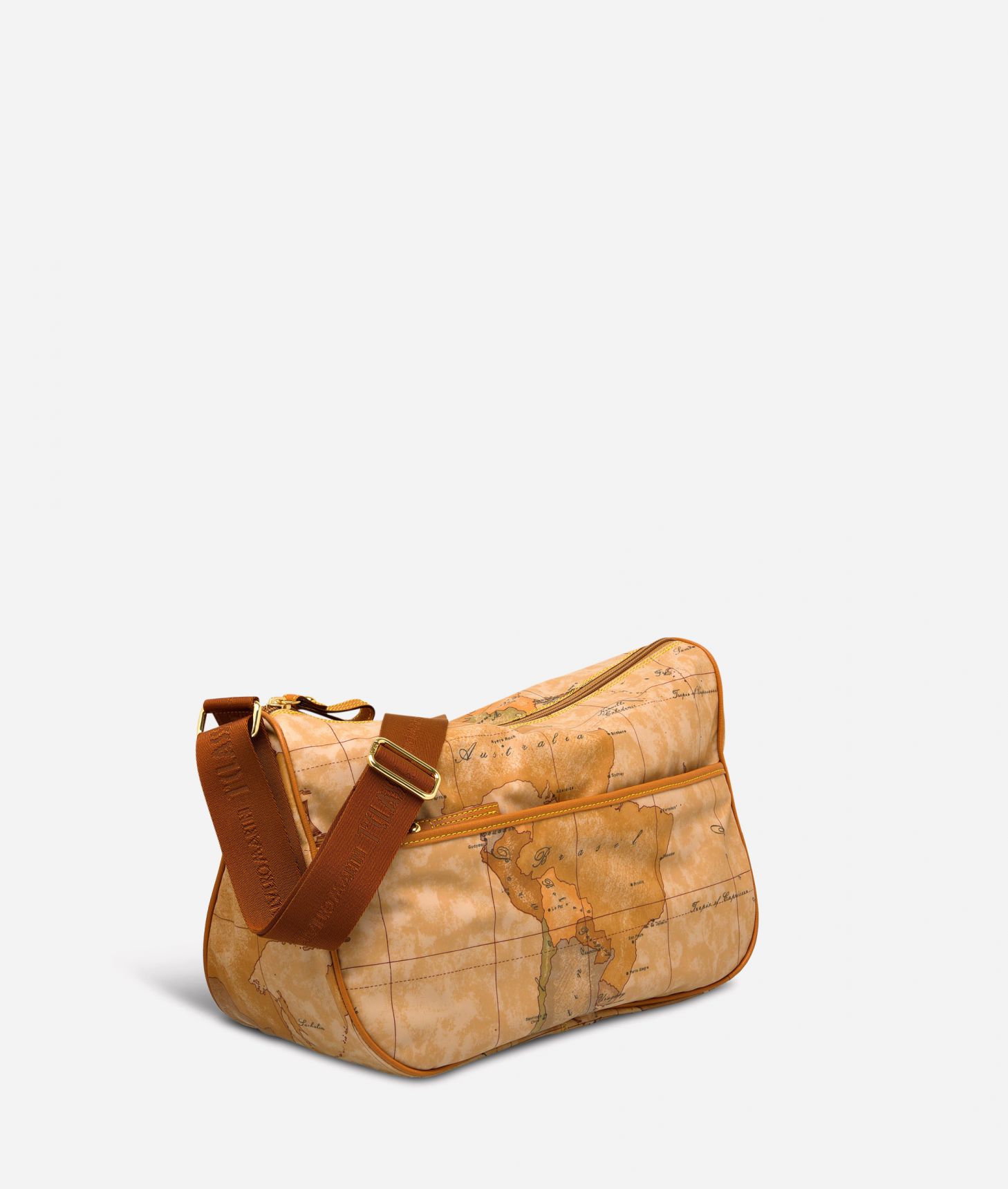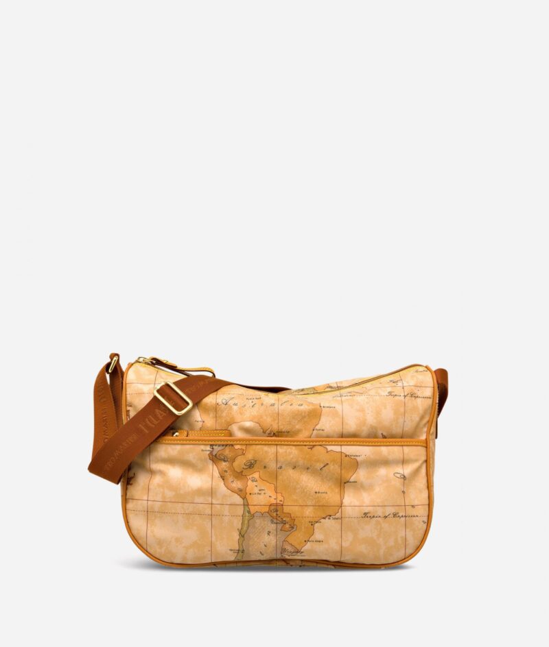 Borsa a tracolla in tessuto stampato con cartina geografica Geo Soft. Metalleria con logo 1AClasse e finiture in oro. Riporti e dettagli in pelle di vacchetta color cuoio. Tasca frontale chiusa con zip.