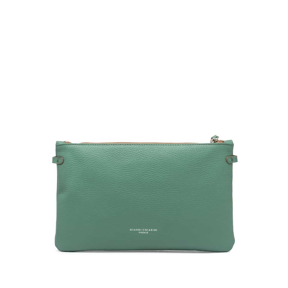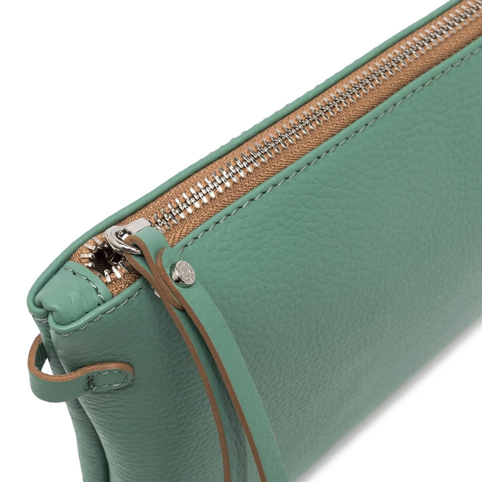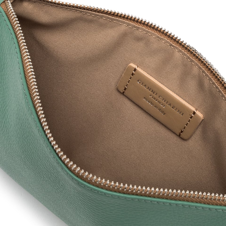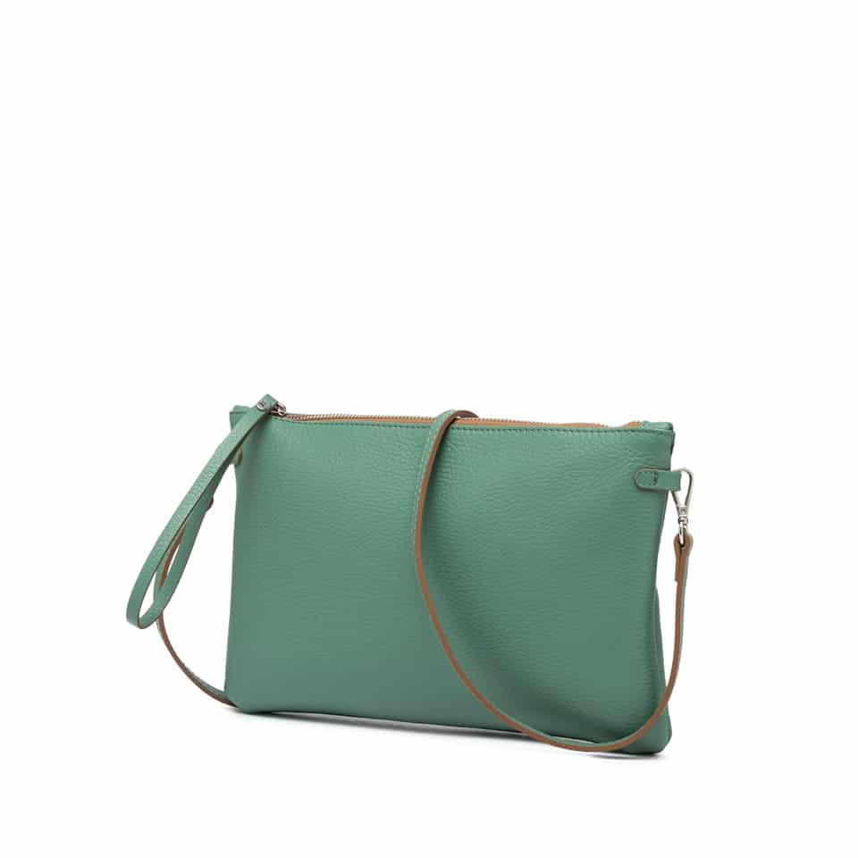 Hermy in grana dollaro, clutch con zip in testa. Tracolla in pelle di servizio.