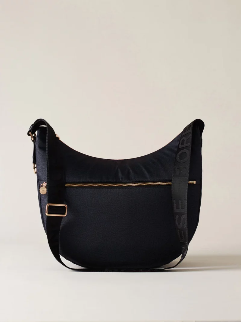 L’iconica Luna Bag di Borbonese è una “hobo” Medium realizzata in nylon OP riciclato e pelle. La cinghia per tracolla, regolabile, è in nastro di nylon logato con fibbia autobloccante. La chiusura principale e quella della tasca esterna sono garantite da una zip con tiralampo a forma di vite stilizzata, simbolo del brand. L’interno, foderato in tessuto jacquard, ha tre tasche di cui una con zip. Le metallerie sono in galvanica oro chiaro.