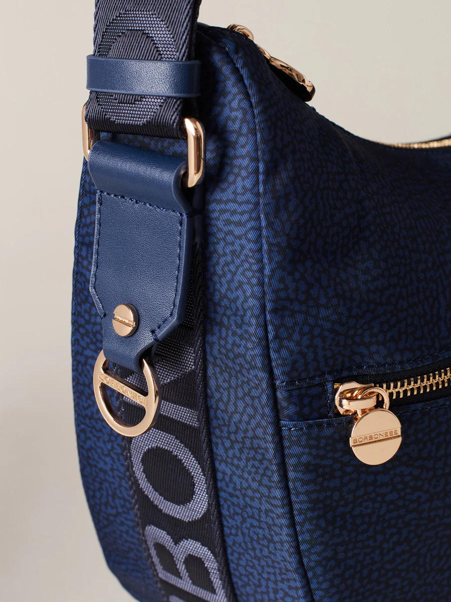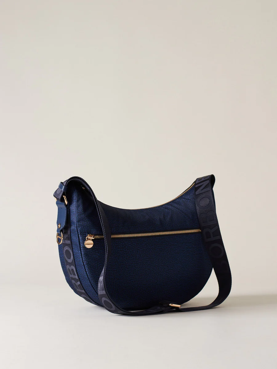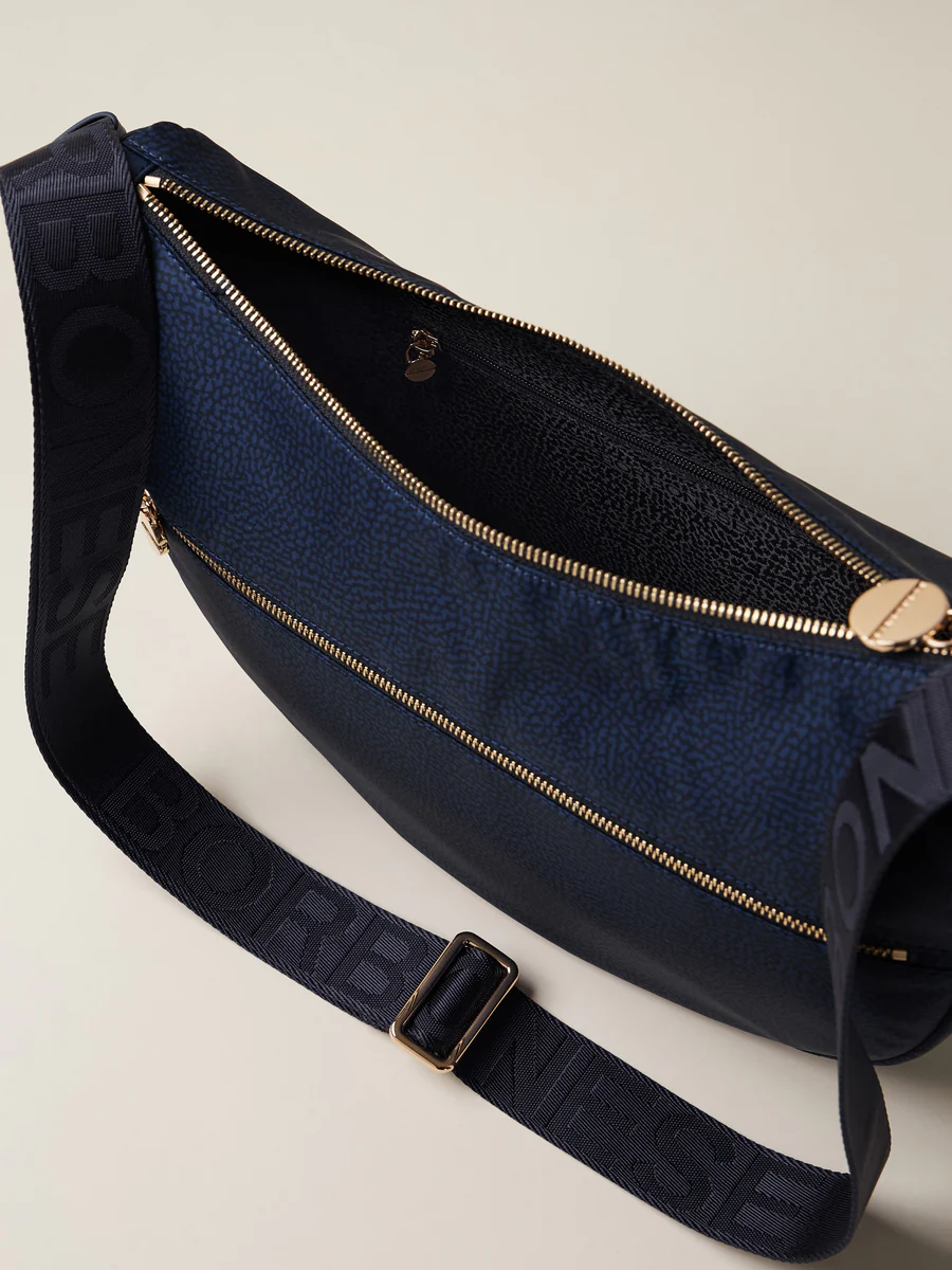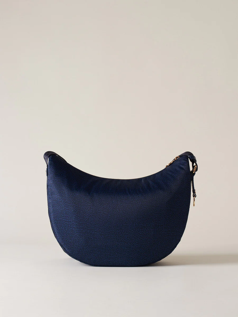 L’iconica Luna Bag di Borbonese è una “hobo” Middle realizzata in nylon OP riciclato e pelle. La cinghia per tracolla, regolabile, è in nastro di nylon logato con fibbia autobloccante. La chiusura principale e quella della tasca esterna sono garantite da una zip con tiralampo a forma di vite stilizzata, simbolo del brand. L’interno, foderato in tessuto jacquard, ha tre tasche di cui una con zip. Le metallerie sono in galvanica oro chiaro.