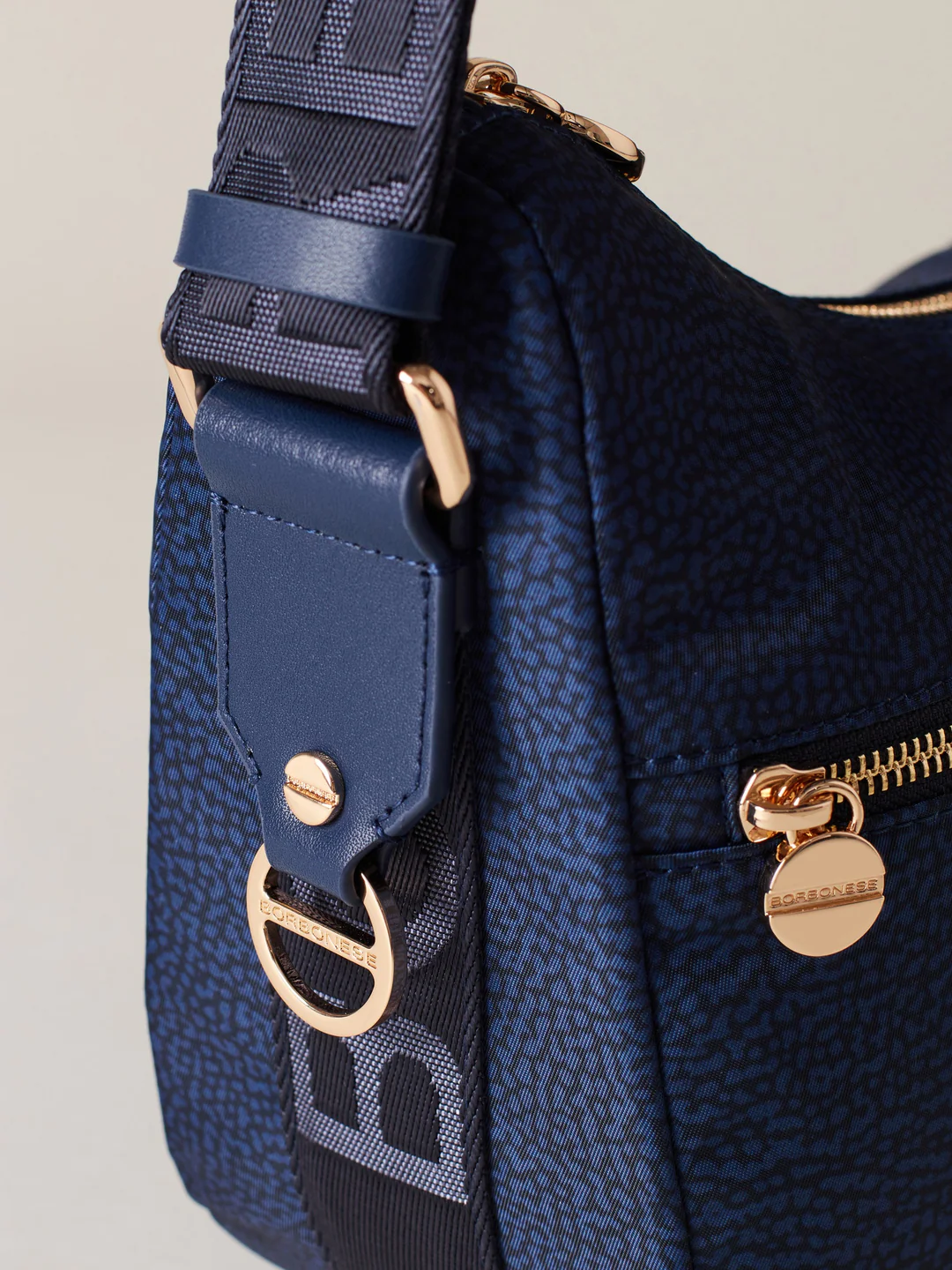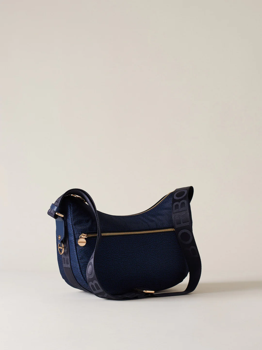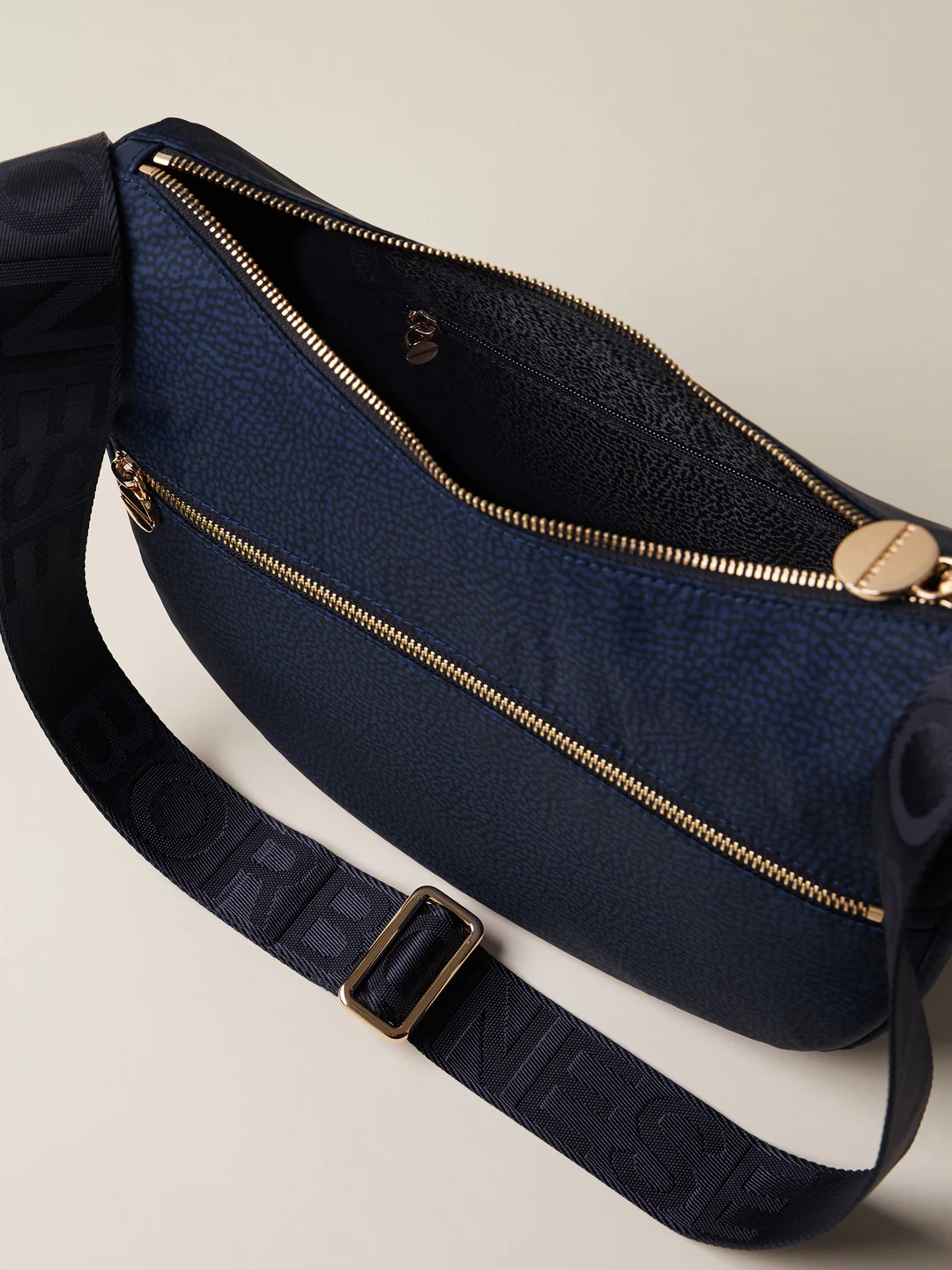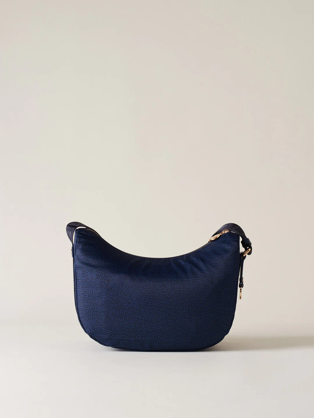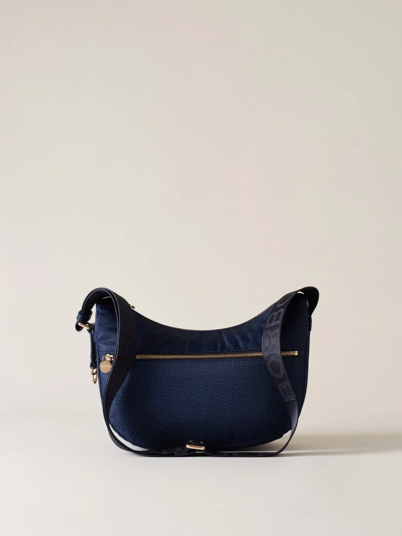 L’iconica Luna Bag di Borbonese è una “hobo” Small realizzata in nylon OP riciclato e pelle. La cinghia per tracolla, regolabile, è in nastro di nylon logato con fibbia autobloccante. La chiusura principale e quella della tasca esterna sono garantite da una zip con tiralampo a forma di vite stilizzata, simbolo del brand. L’interno, foderato in tessuto jacquard, ha tre tasche di cui una con zip. Le metallerie sono in galvanica oro chiaro.