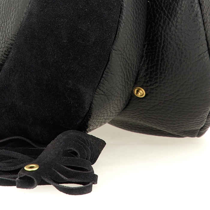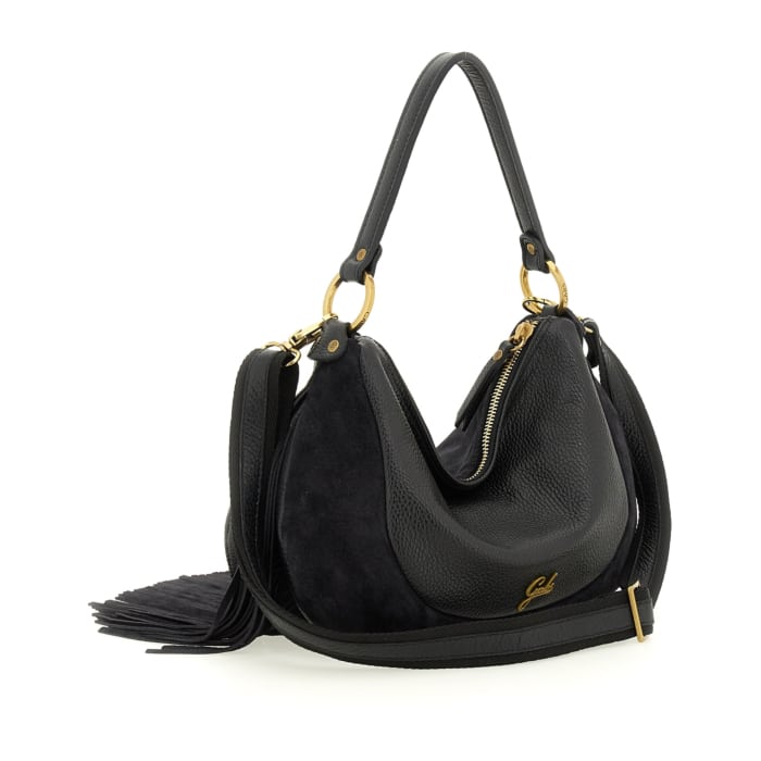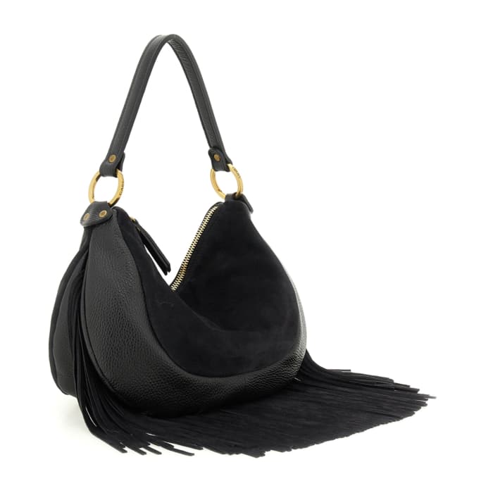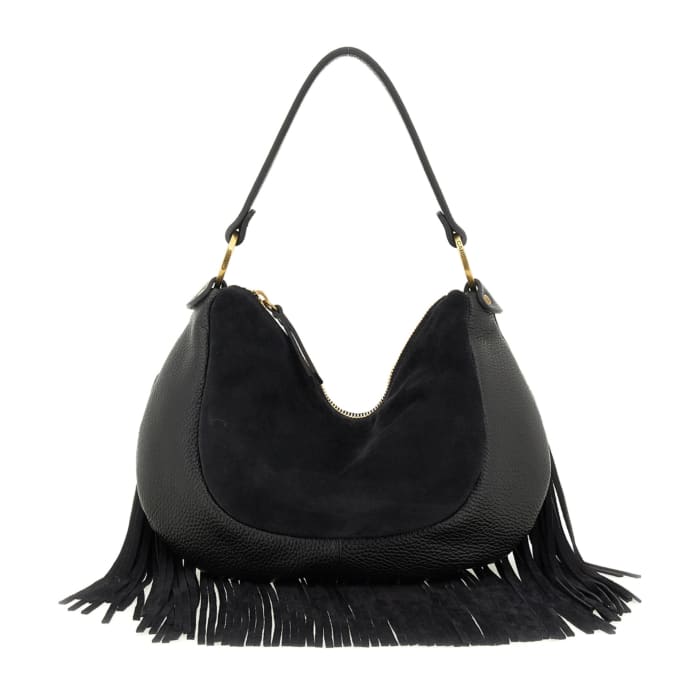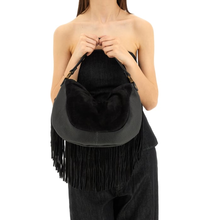 Linea Trinidad Special – Borsa a spalla in pelle di vitello scamosciata e vitello martellato con frange rimovibili