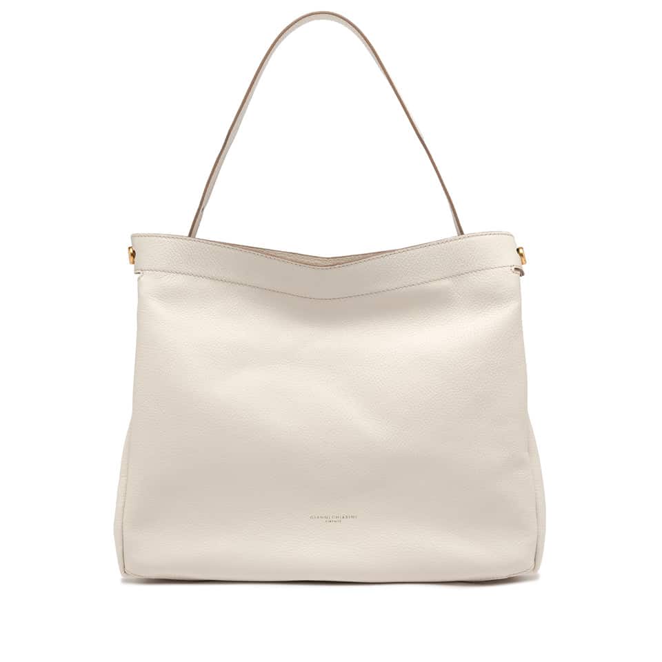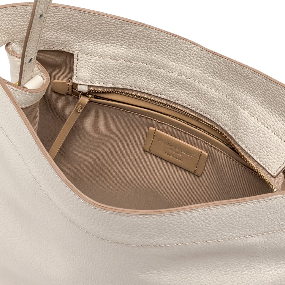 La linea Ottavia by Gianni Chiarini Firenze è realizzata in pelle martellata. Capiente e daily è caratterizzata da una doppia portabilità: crossbody o a mano grazie alla maniglia regolabile. Arricchita dal grande gemello logato e dotata di una chiusura superiore con zip.