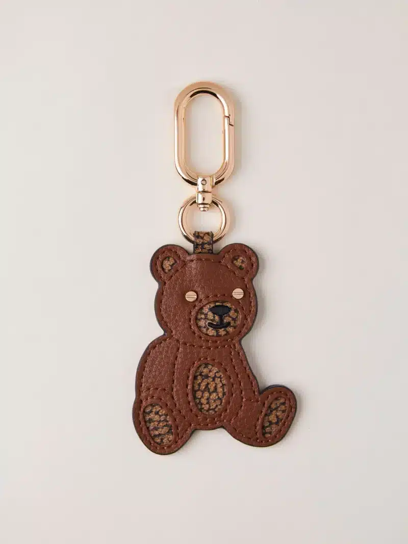 Un orsetto è il simbolo del portachiavi di pelle e tela rivestita OP. Il moschettone è di metallo con galvanica oro chiaro. Può essere utilizzato come decorazione per impreziosire la tua borsa preferita.