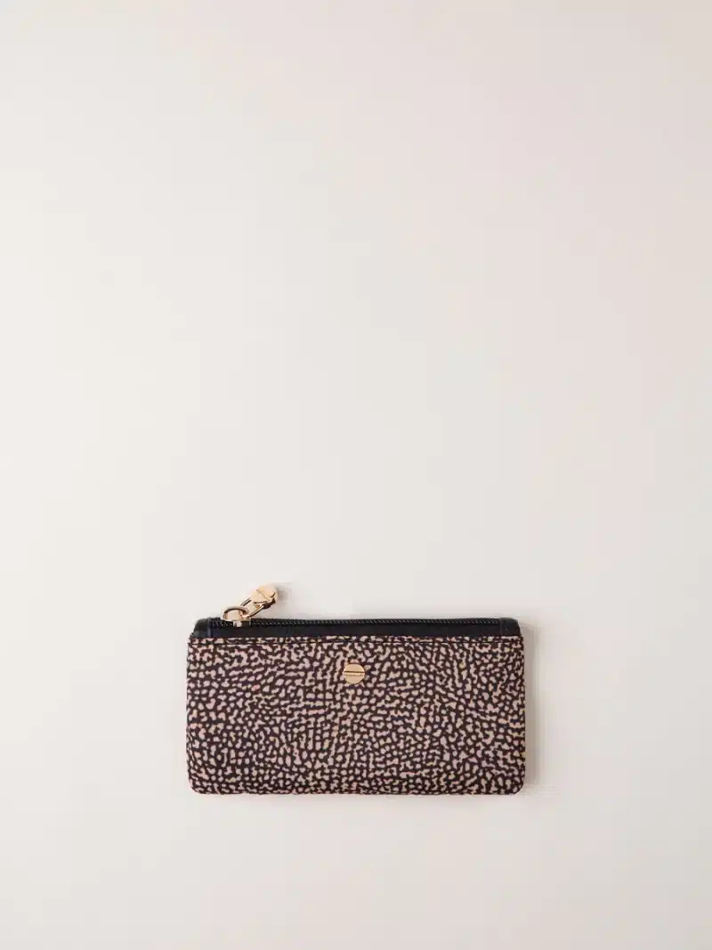 Elegante busta portachiavi realizzata in nylon OP riciclato. L’articolo è regolato da una zip con tiralampo a placchetta logata. La vite, simbolo del brand, diventa un elemento decorativo applicata sul fronte. Interno foderato. Tutte le metallerie sono in galvanica oro chiaro.
