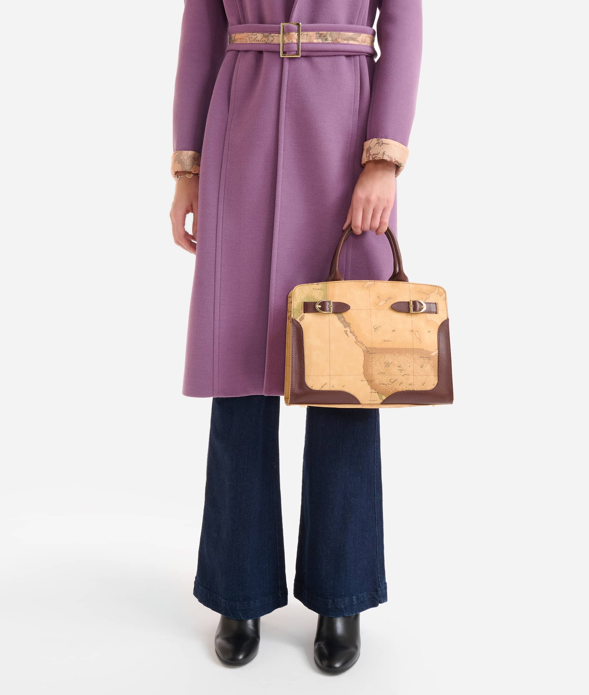 La borsa a mano in tessuto Geo Classic evoca paesaggi e tradizioni della Scozia in un design essenziale: il nome della Linea richiama le linee dolci degli inserti in pelle granata, declinati in eleganti tonalitĂ  autunnali, mentre i listini con fibbiette logate 1C riprendono motivi equestri. I manici ripiegati e la tracolla regolabile e rimovibile in pelle granata consentono una doppia portabilitĂ , mentre l’interno è capiente e organizzato in piĂą tasche. Silhouette strutturata e dettagli raffinati in un modello che incarna l’heritage 1á´¬ Classe con il tocco unico della Collezione Destiny Land.