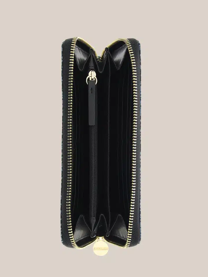 Compact and linear, this Op-print Jet nylon zip around wallet large is extremely functional. The zip pull is shaped as the brand’s iconic stylised screw logo. It also features RFID, jacquard woven fabric lining, an interior zip-up coin compartment and multiple card slots. Light gold plated metal parts.