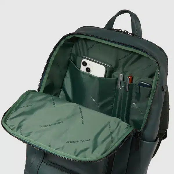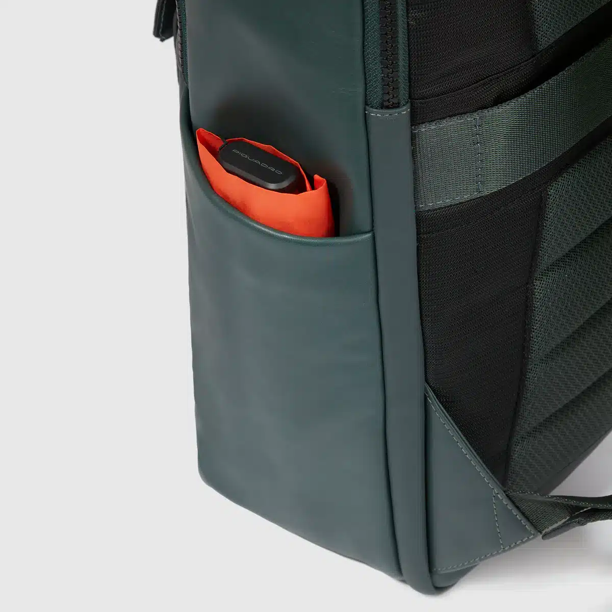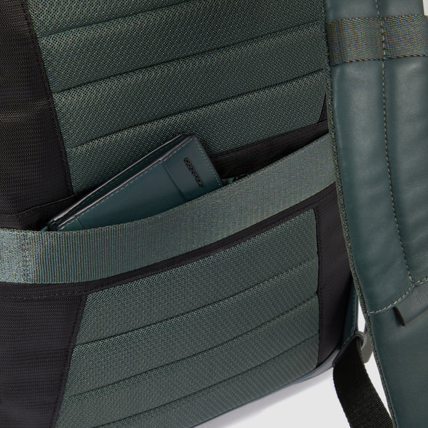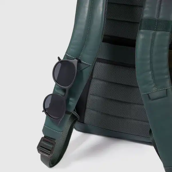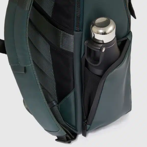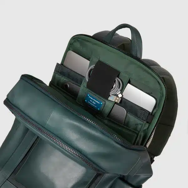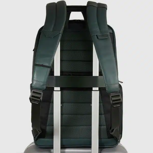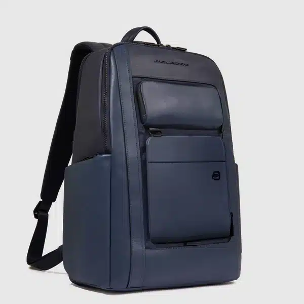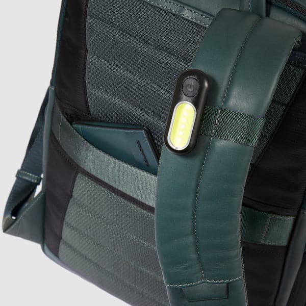 Zaino uomo porta pc e iPad®Pro 12,9″ in tessuto riciclato e pelle con protezioni antiurto e anti frode RFID e aggancio per luce portatile da bici
